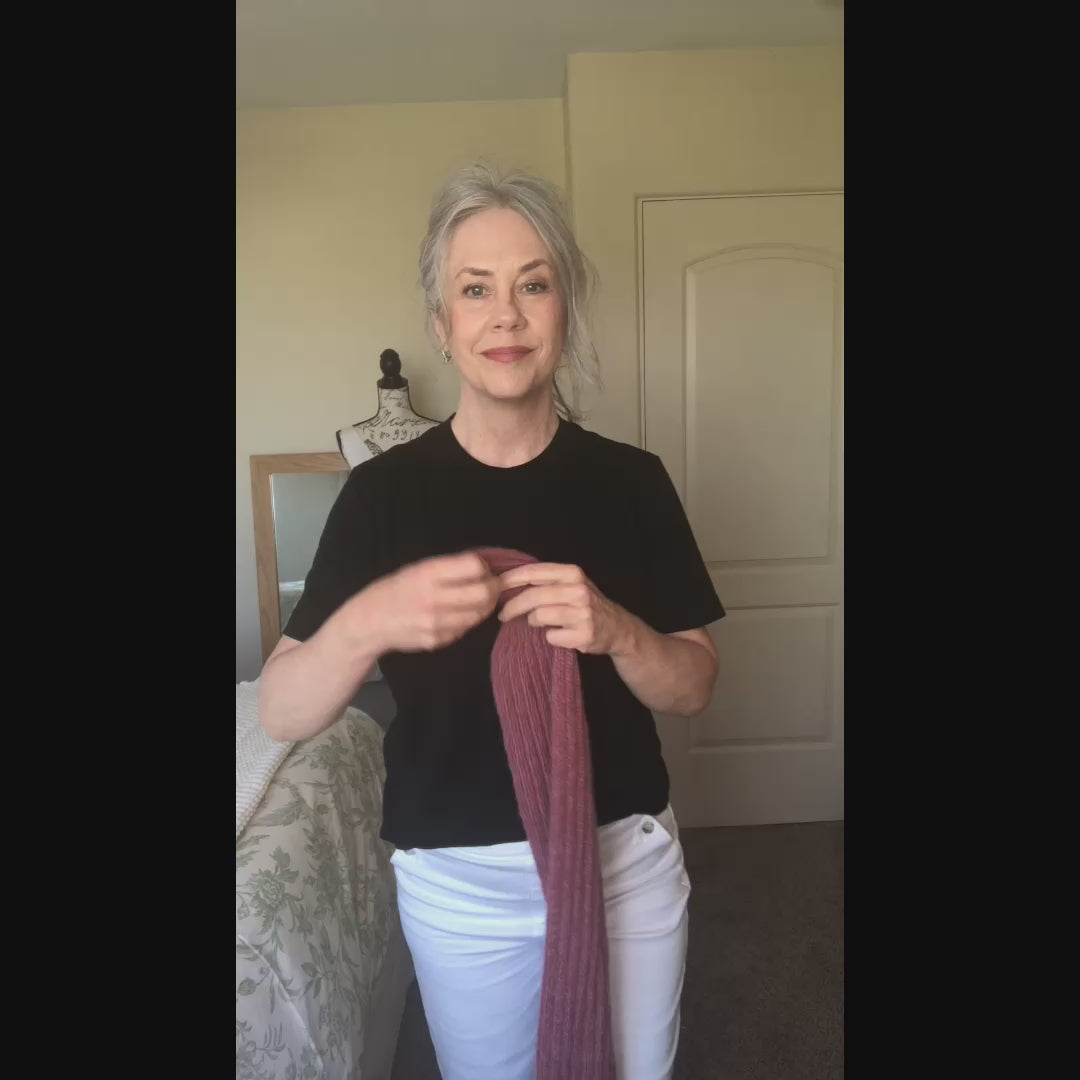 But luxury doesn't have to mean complicated. This scarf knits seamlessly in one piece using a timeless 2x2 rib that shows off the cashmere's incredible drape. The clever construction features just one discreet seam that creates a charming keyhole detail—sophisticated style without any fussy techniques. It's meditative simplicity that looks impressively elegant.